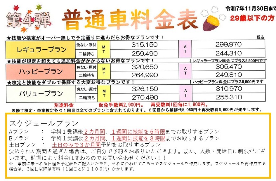 技能や検定がオーバー無しで予定通りに進んだ場合の料金です。